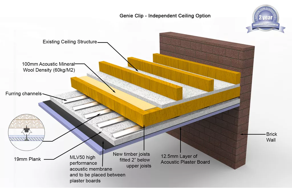 When Impact noise is extremely high and you can afford to lose some ceiling height, then our Independent Genie clip solution would work best for you and your ceiling soundproofing. Decoupling the new structure from existing and using the genie clip mount, will give the maximum improvement in impact and airborne noise. *This solution can be further upgraded with MLV 50 and/or 15mm Db boards.
